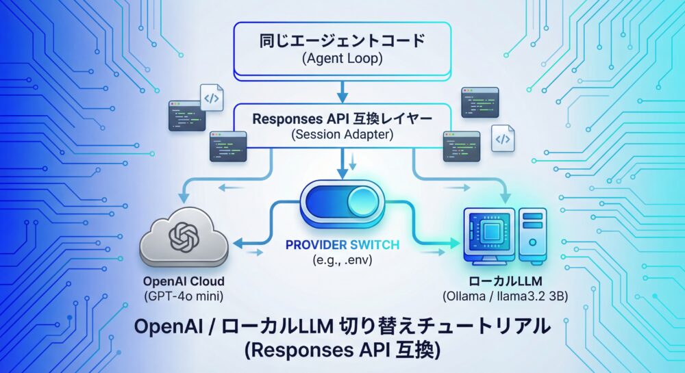 本記事では、こうした悩みに対して「OpenAI Responses API 互換」という軸を中心に、OpenAI と Local LLM(軽量モデル)を、プロバイダー切り替えだけで運用する方法を解説します。